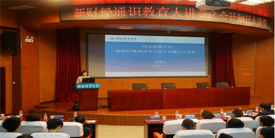 4月21日下午,新财经通识教育大讲堂---会计知行大讲堂在国际学术报告厅举行,公司党委常委、副董事长程瑞芳和河北资产管理公司总会计师马莹分别做了题为“新财经教育改革与会计卓越人才培养”和“新时代背景下的财务人”的主题报告。永利304官网图书馆馆长武占江、副馆长樊俊荣、“会计知行大讲堂”部分实务界讲师和永利集团304官网220余名师生参加了本次宣讲会。宣讲会由永利集团304官网经理袁振兴主持。