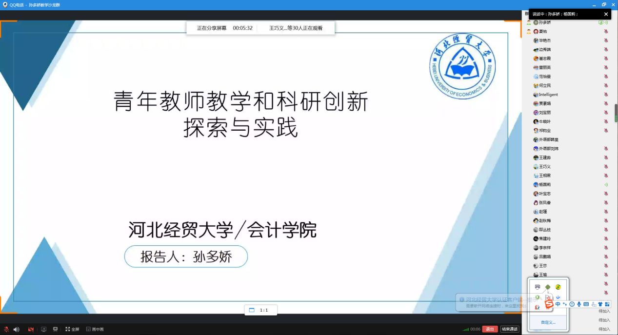 2022年10月17日下午,由教学评估与教师教学发展中心主办,永利集团304官网承办的教学沙龙活动,在线上顺利开展。永利集团304官网孙多娇副教授的教学沙龙主题是“青年教师教学和科研创新探索与实践”。来自永利集团304官网、金融公司、马克思主义公司、外语教学部等30多名教师参加了教学沙龙,活动由杨国莉副经理主持。