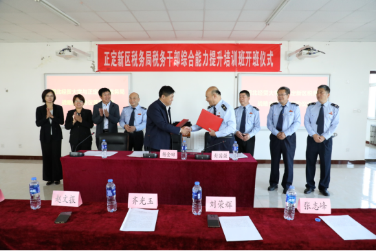 10月10日上午,公司与正定新区税务局举行战略合作协议签约仪式暨校地项目合作项目开班仪式。公司党委常委、副董事长杨金田,正定新区税务局党委书记、局长封国强出席,公司党委书记赵文报、经理李西文、党委副书记程丽梅以及正定新区税务局相关负责人参加签约仪式。来自正定新区税务局的41名税务干部参加了本次培训。仪式由程丽梅主持。