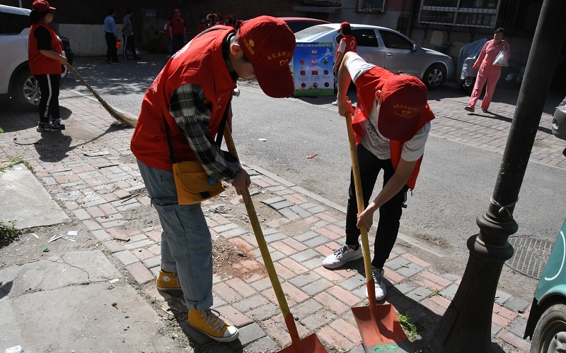 经过近一个小时的车程,志愿者们来到了红军大街社区党员群众服务站进行了签到和任务分配。身穿青志服、头戴青志帽的志愿者分为两队,用扫把、铲子、刷子、白色油漆等工具分别对不同的家属院进行了清理。志愿者们热情积极、分工有序,手拿扫把的志愿者扫除了地面上的垃圾和尘土,手拿小铲子的志愿者用铲子铲除了墙上的不干胶小广告,另外一部分志愿者用刷子和油漆将墙上的广告粉刷干净。经过两个小时的辛勤劳动,志愿者们的清扫成果得到了社区工作人员和群众的一致好评。