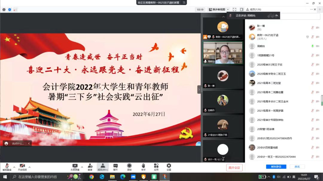 6月27日下午,永利集团304官网2022年暑期社会实践“云出征”仪式正式启动。院团委书记周晓玲出席,社会实践各小分队成员及团支书共计125名同学参与。