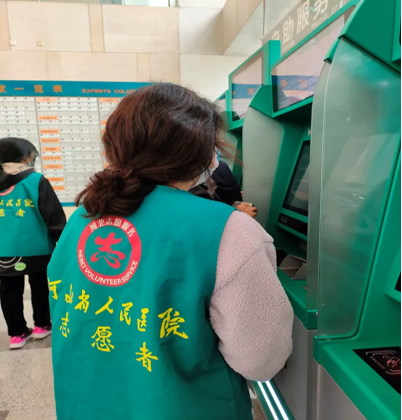 3月16日,在河北省人民医院,志愿者们帮助患者使用自助服务机器,解决挂号、取号等方面的疑惑,提高了患者就医的效率。