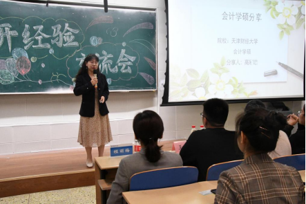 高寒琼学姐以专业排名第一的成绩考取天津财经大学会计学硕。她表示,考研院校有旱区、水区之分,因此院校的选择十分重要,名校虽好,但还是得结合自身实际情况选择报考院校。同时学姐还详细介绍了考研期间每天的时间分配。在学姐的介绍中,我们了解到了考研的刻苦与艰辛,学姐结合自身经历,知无不言,毫无保留的分享关于自己优势科目政治、英语的学习方法,同学们受益匪浅。