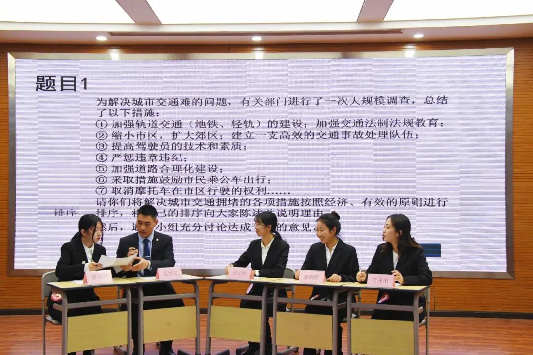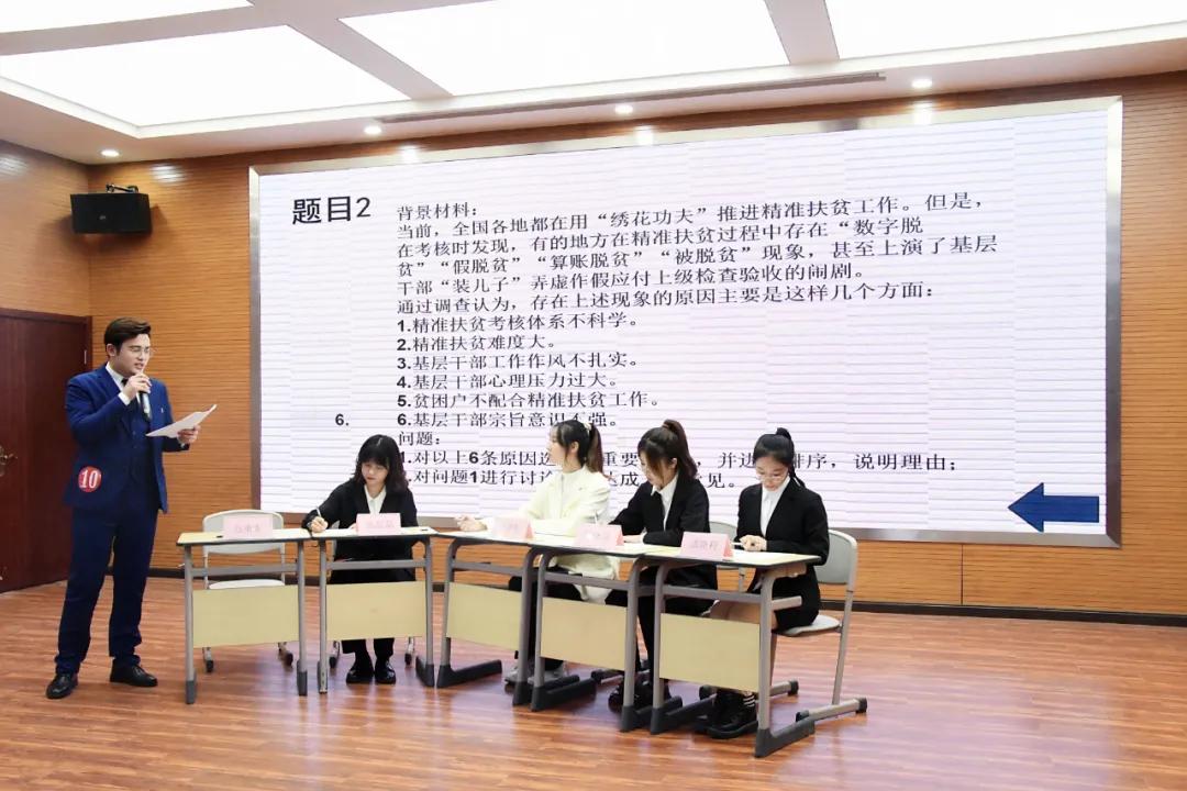 无领导小组讨论环节,10名选手分为两组,每组在三道题目中自由选择一道进行讨论。选手们认真审题、严谨作答,展现出良好的组织协调、团队合作等能力。比赛过程精彩纷呈,获得在场观众和嘉宾评委一致好评。