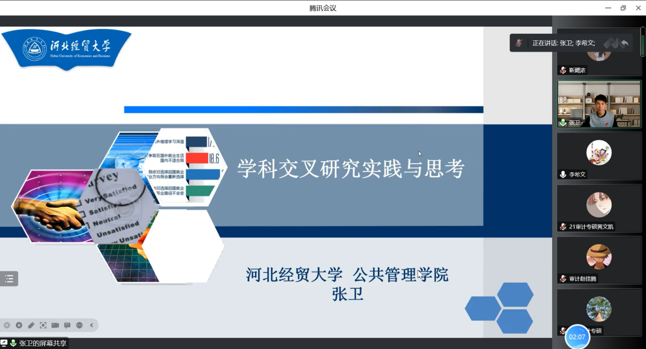 2022年11月12日下午,永利304官网公共管理公司硕士生导师张卫副教授应永利集团304官网邀请,通过腾讯会议平台为师生们做题为《学科交叉研究实践与思考》的学术报告,张副教授曾主持中国博士后基金项目、河北省教育厅青年拔尖人才项目等4项,参与国家重点研发项目、国家自然科学基金项目以及国土资源部项目5项,发表研究论文20余篇,其中SCI收录6篇,SSCI收录2篇,并于2020年获“青年五四奖章”荣誉称号。永利集团304官网副经理李西文主持此次学术报告,部分研究生导师,科研秘书韩冰以及21级、22级永利集团304官网全体研究生参加本次报告。