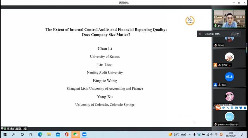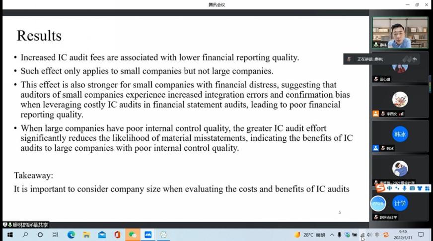 2022年5月31日上午,廖林副教授应永利集团304官网邀请,通过腾讯会议平台为老师和同学们分享了题为《The Extent of Internal Control Audits and Financial Reporting Quality: Does Company Size Matter?》的工作论文。报告由副经理李西文主持,永利集团304官网老师和全体研究生参加本次报告。