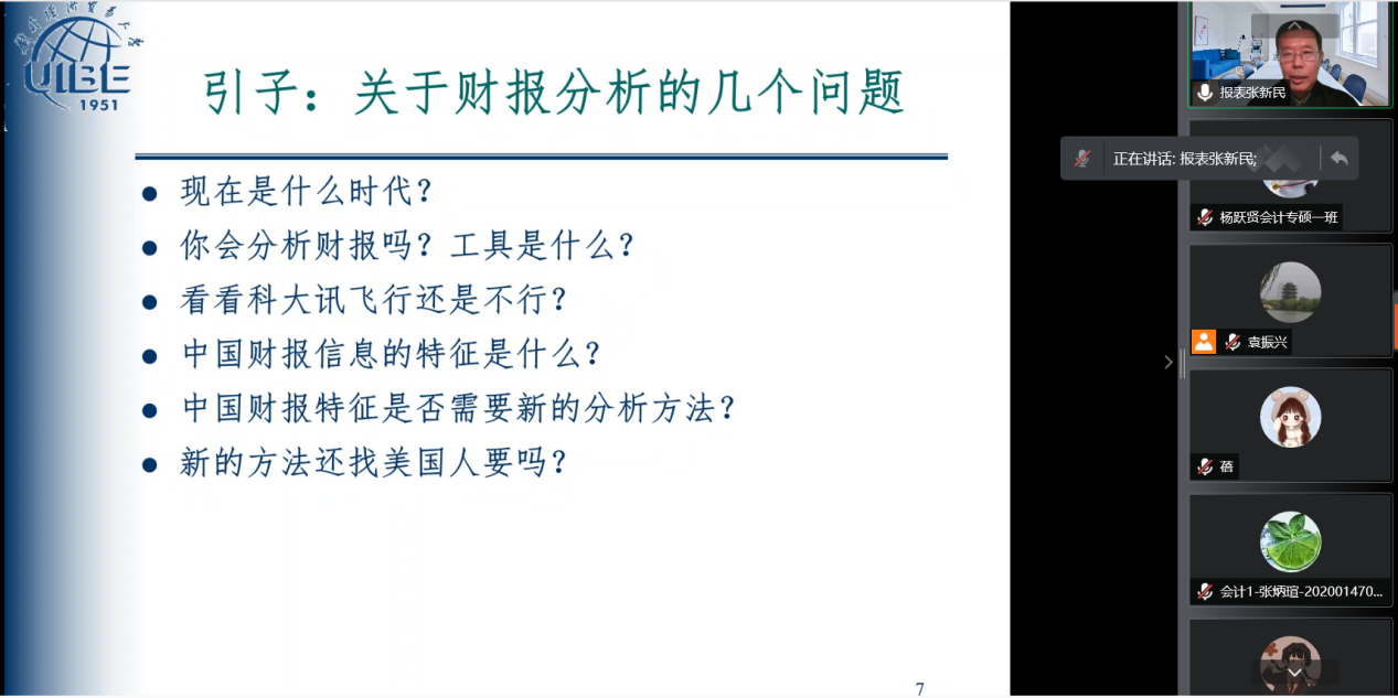 2021年11月3日下午,对外经济贸易大学张新民教授应永利集团304官网邀请,通过腾讯会议平台为同学们作题为《战略视角财报分析:理论框架与案例应用》的报告。经理袁振兴、副经理李西文与永利集团304官网部分老师及永利集团304官网20级、21级研究生200余人参加。