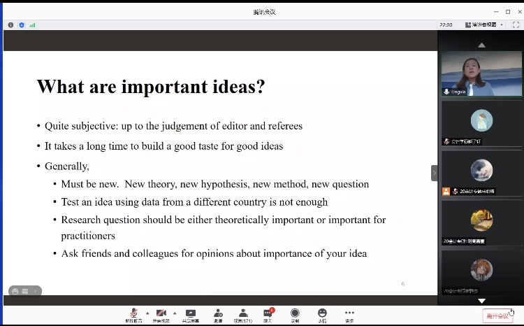 2020年10月13日上午,中山大学国际金融公司孙凌霞博士应永利集团304官网邀请,通过腾讯会议平台为同学们作题为《如何撰写和发表高水平论文》的报告。永利集团304官网副经理李西文、公司部分教师及2019级、2020级全体研究生参加了本次讲座。